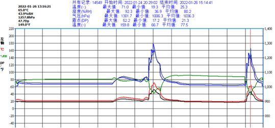 从密闭环境内部传感器数据可以看到,腔体内部的压力随着温度的升高而增大,当产品强度比较低时就会出现变形甚至爆裂现象。